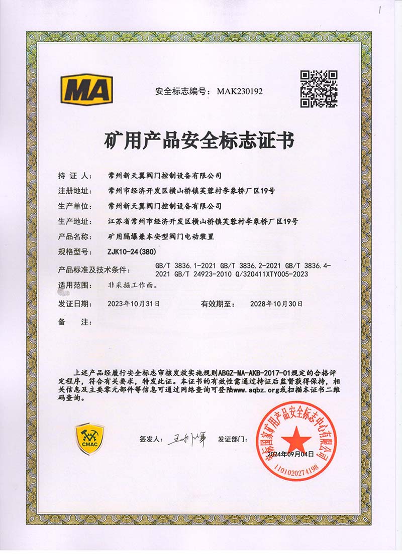 礦用產品安全標志證書ZJK180-24(380)