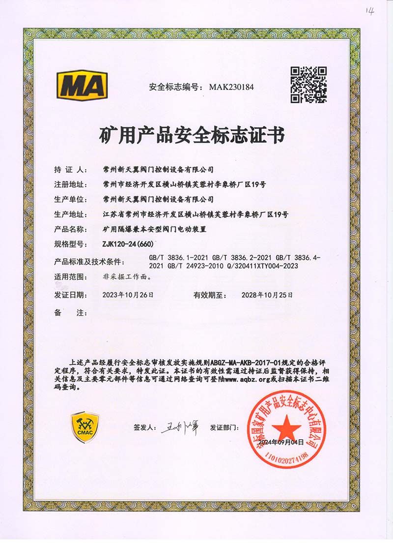 礦用產品安全標志證書ZJK120-24(380)