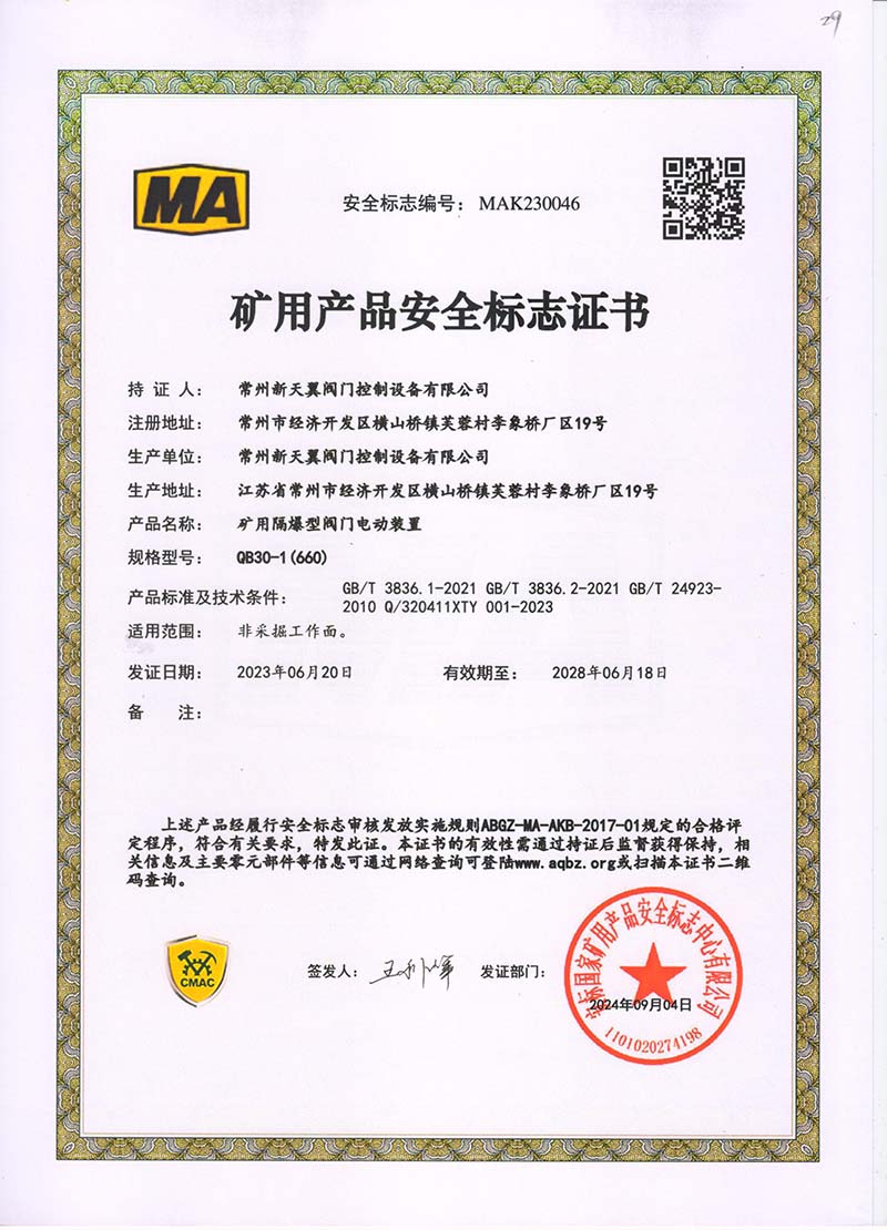 礦用產品安全標志證書QB30-1(660)